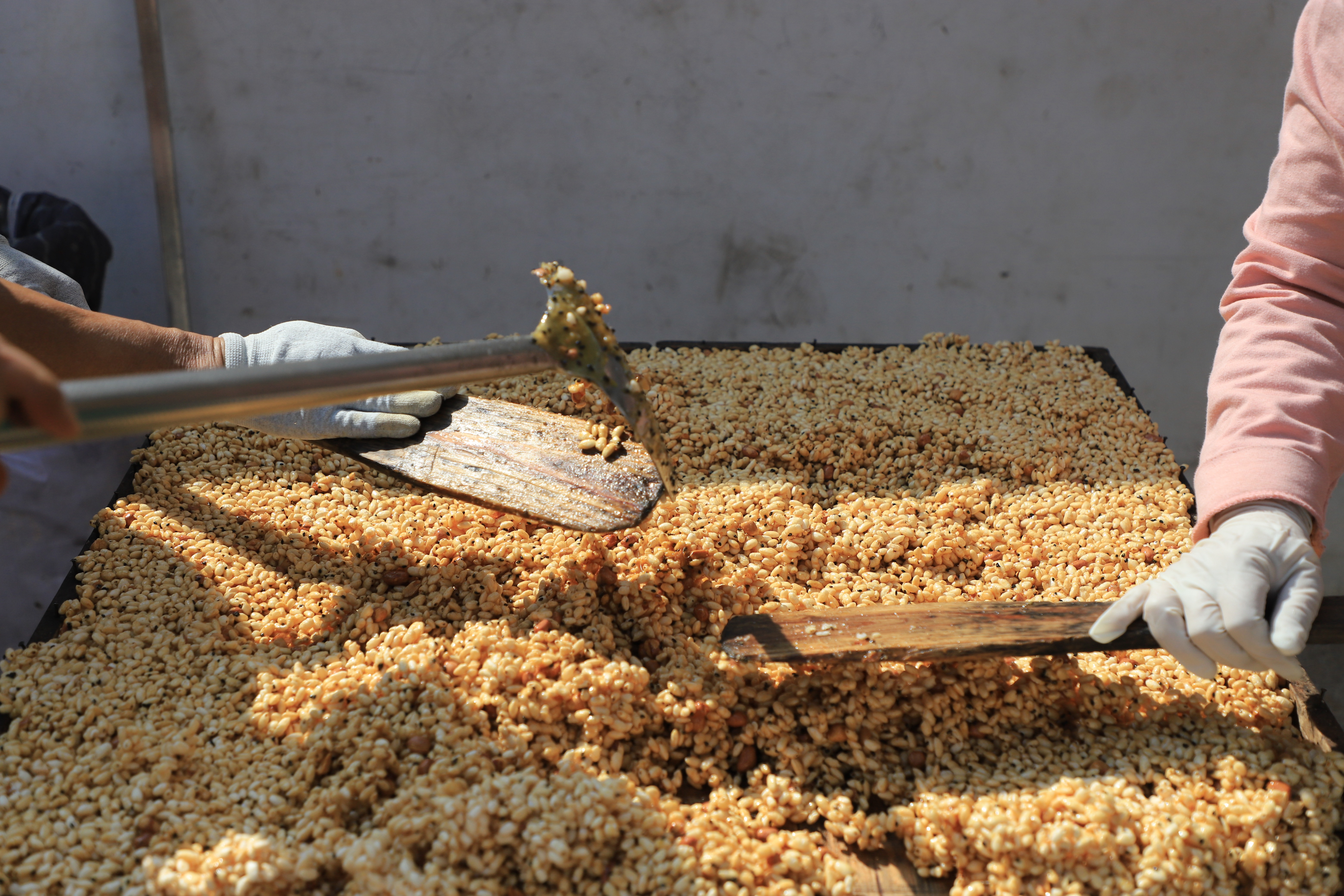 第二步,將白糖倒進(jìn)鍋里,用大火干煮,直到白糖全部熔化,再放入生花生,待花生差不多熟了,再放入生芝麻,滾煮一會,將爆米花倒入鍋內(nèi),通過不斷攪拌讓其與糖漿、花生、芝麻充分融合。“生花生倒入白糖漿里干煮,熟后很爽脆,就像炒的一樣!闭f起這一步驟的訣竅,鄧培興說,“一定要用生花生,這樣花生就不會因為燒得太熟、太脆而容易碎。芝麻一定要后下,不然會太焦!