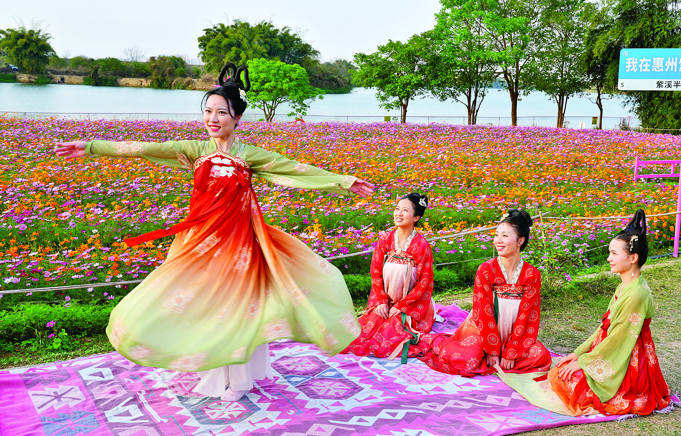 惠州市惠城區(qū)三棟鎮(zhèn)紫溪半島鮮花盛開美不勝收,游人即興起舞與爛漫景色相映成趣。
