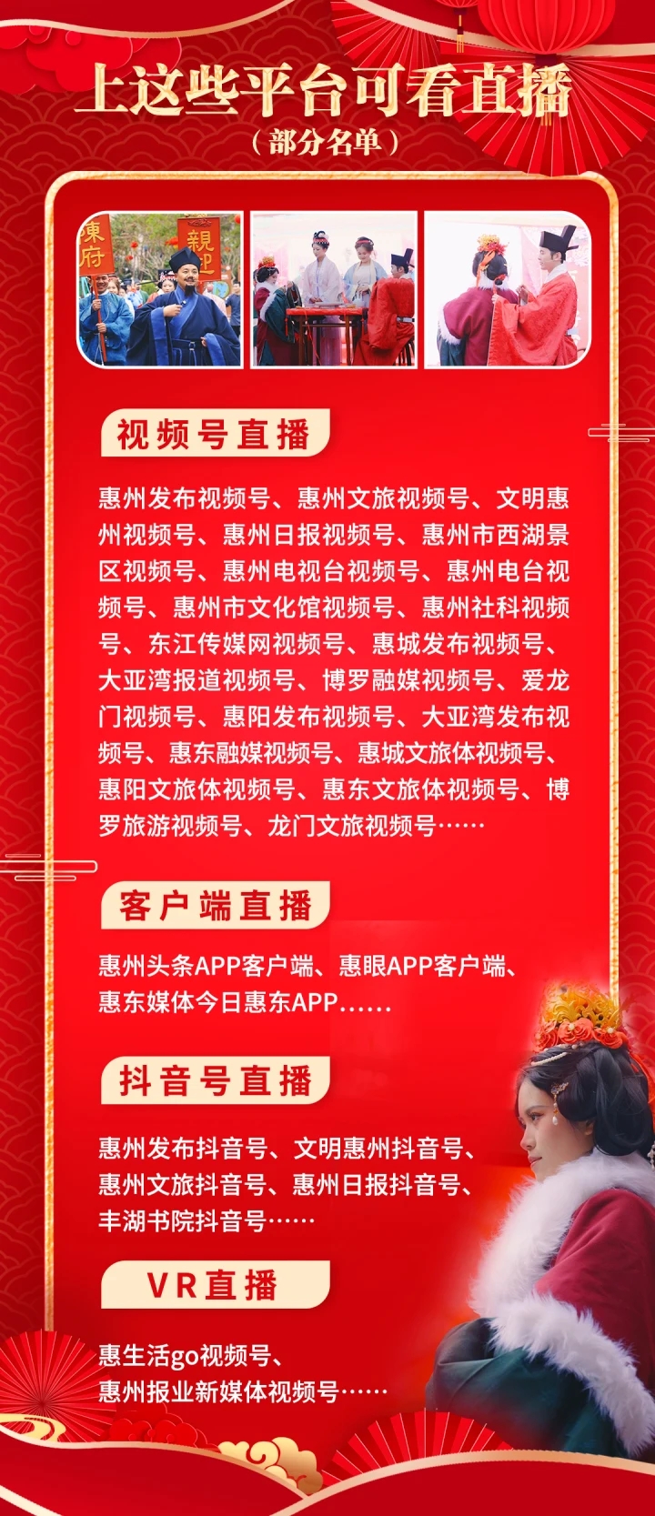 今日是農(nóng)歷大年初三,上午10:00至11:20,惠州西湖將繼續(xù)上演精彩的宋式婚禮秀,F(xiàn)場(chǎng),“蘇東坡”作為婚禮主持人,帶市民和游客近距離體驗(yàn)一場(chǎng)原汁原味的宋式婚禮。屆時(shí),將有40多個(gè)新媒體平臺(tái)進(jìn)行現(xiàn)場(chǎng)直播。