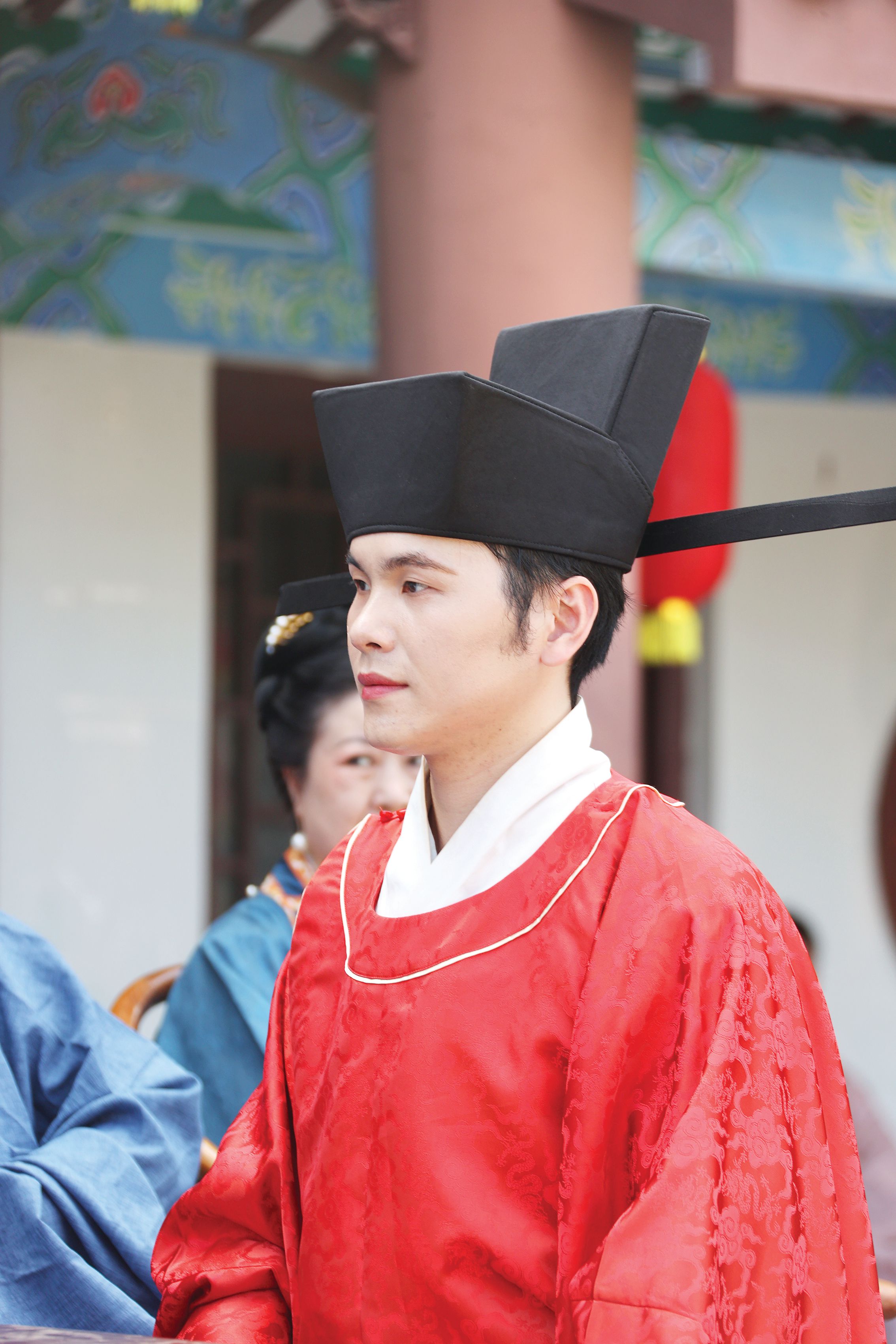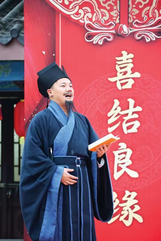 來自陜西漢中的唐東是一名專業(yè)婚禮策劃、主持人。一個(gè)月前,他接到了扮演蘇東坡角色的任務(wù),擔(dān)任“儐相”一職。唐東說,在宋式婚禮秀中,儐相角色臺(tái)詞多,而且是文言文,自己第一次演繹“蘇東坡”角色,如何展現(xiàn)東坡先生的豪邁之情,給他帶來一定的挑戰(zhàn)。時(shí)間緊、任務(wù)重,唐東前期查閱資料學(xué)習(xí)東坡文化,希望將角色演繹得盡善盡美。同時(shí),他還參與臺(tái)詞的編排和流程的制定及完善,對(duì)婚禮秀演繹場(chǎng)景提出專業(yè)的意見建議。