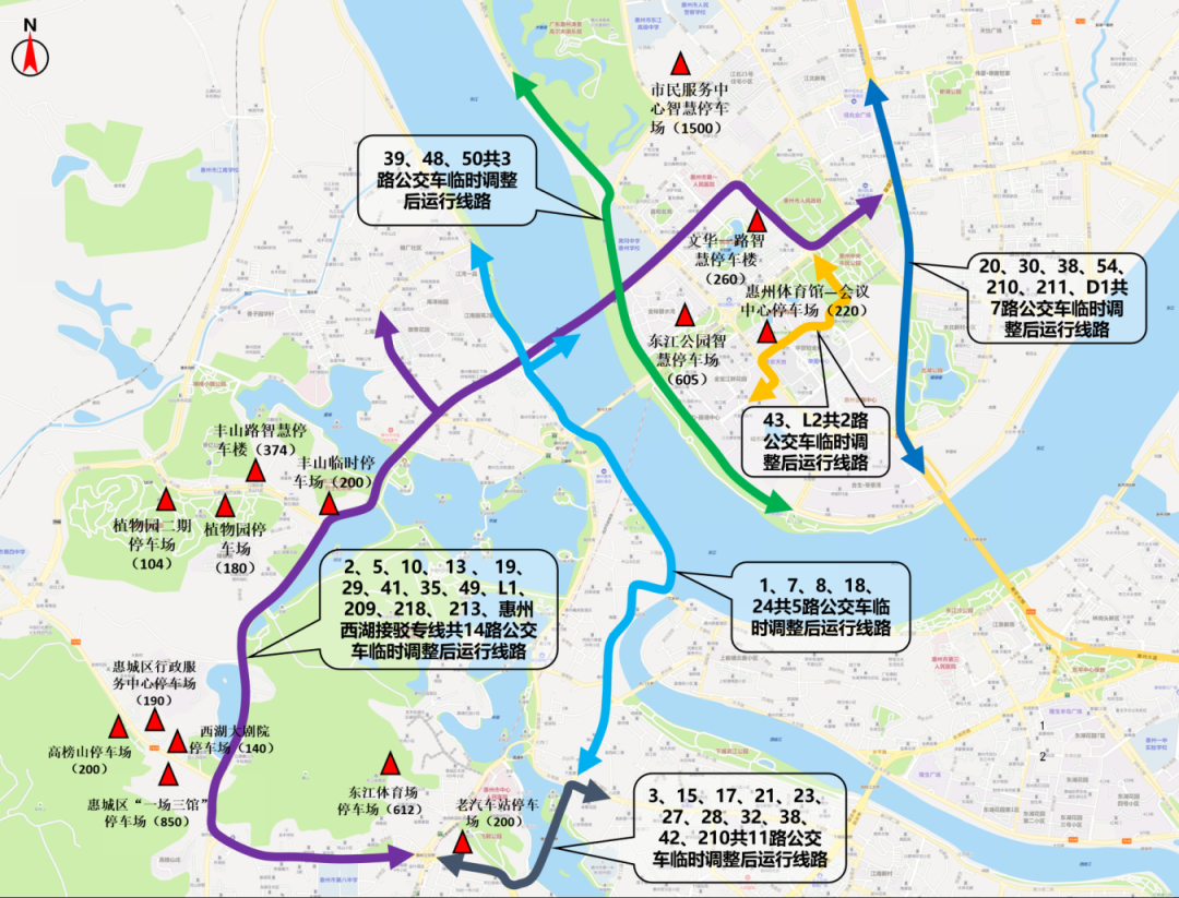 圖2 “舞動中國龍——全國龍舞大巡游暨2024廣東惠州多彩非遺鬧元宵活動”期間部分公交線路調(diào)整及周邊停車場示意圖