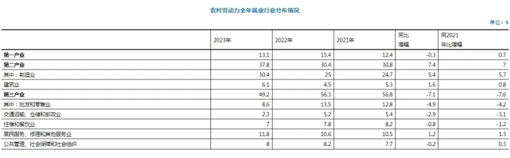 從農(nóng)村勞動(dòng)力全年從事主要職業(yè)分布數(shù)據(jù)看,2023年新產(chǎn)業(yè)、新業(yè)態(tài)、新商業(yè)模式就業(yè)占比達(dá)到67.3%,同比增長(zhǎng)2.5個(gè)百分點(diǎn),其中,新生代農(nóng)村勞動(dòng)力占比55.5%。