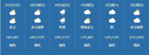 周四:多云到陰天轉(zhuǎn)分散小雨,早晚有(輕)霧,17~25°C;
