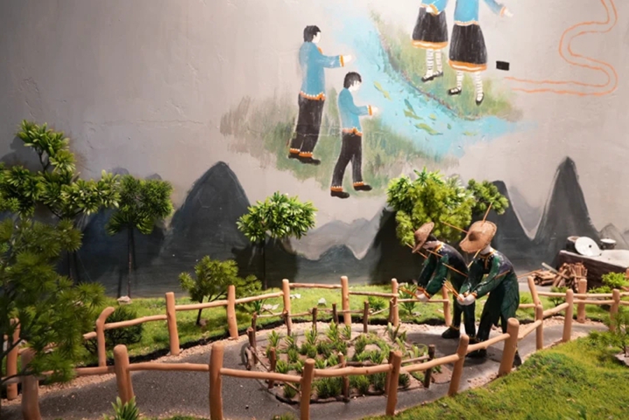尤其是“特色文化”部分,分別展示“舞火狗”、瑤族服飾、“織帶仔”技藝,既有微景觀,也有真物品。“舞火狗”的全部環(huán)節(jié),通過(guò)微景觀塑造,呈現(xiàn)這個(gè)古老習(xí)俗的進(jìn)行時(shí)的狀態(tài),人物形象栩栩如生,引人入勝。