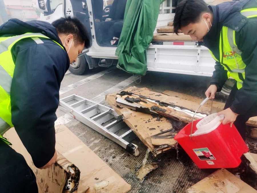 劉良貴聽后,判斷明火應(yīng)該在貨物底部,滅火器無法直接熄滅底部明火,于是和車主四人齊力把家具板材卸到地面,在查找火源的同時幫助車主挽救損失。翻開貨物后,劉良貴等人發(fā)現(xiàn)此時板材過火面積已達(dá)四分之三。為快速撲滅火苗,許森鵬用拖桶提來自來水幫助滅火。