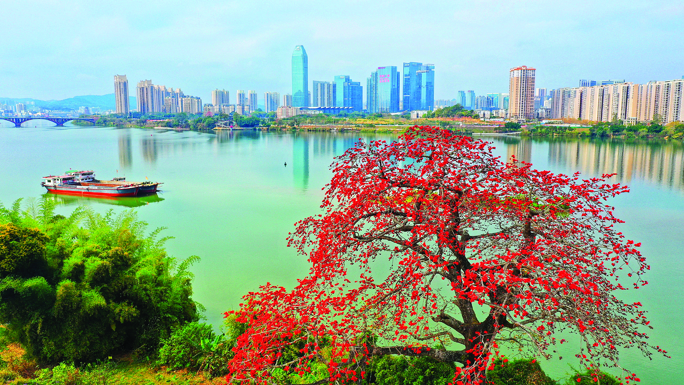 在市區(qū)東江大橋上游南岸有一棵偉岸的木棉樹,至今已有323年的樹齡,每年這個(gè)時(shí)候便會(huì)開滿紅花。