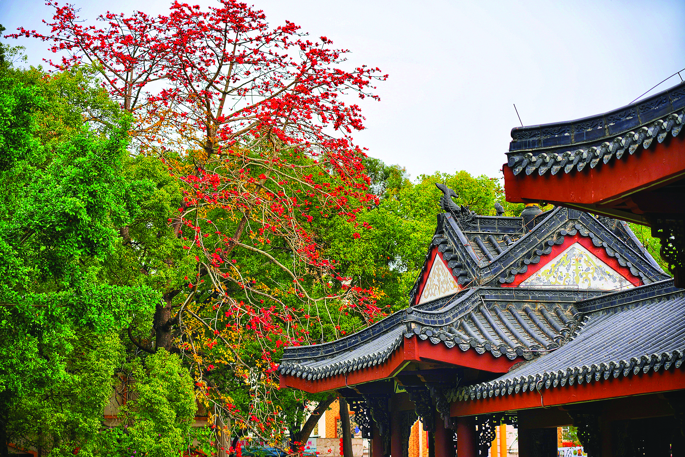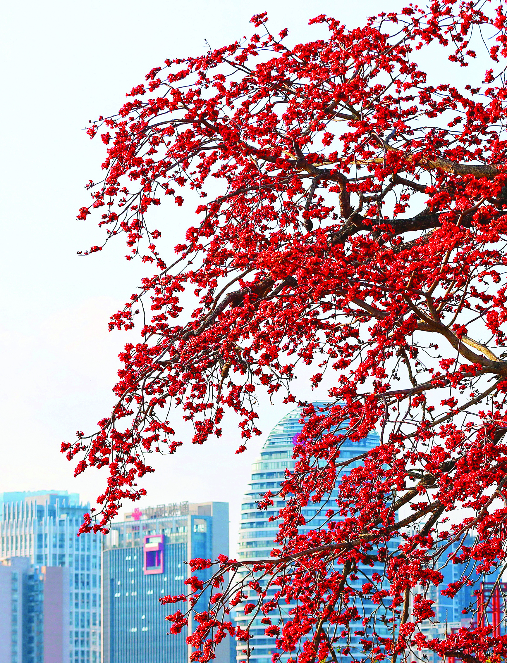 在市區(qū)環(huán)城西路邊,西湖豐渚園、東坡祠等有許多古老的木棉樹開出花朵,鮮紅如火、格外鮮艷,鳥兒在盛開的木棉花枝間飛舞,蜜蜂在花朵間辛勤采蜜,路過的行人也被吸引駐足欣賞拍照。