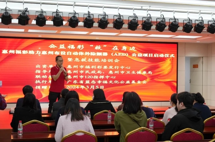 惠州市福利彩票發(fā)行中心副主任周東東介紹,惠州福彩秉承實(shí)現(xiàn)福利彩票“社會(huì)福利的忠實(shí)踐行者,社會(huì)公益的重要的推動(dòng)者”的愿景,一直以來(lái)聚焦服務(wù)惠州的公益事業(yè)。本次活動(dòng)在惠州市委宣傳部、惠州市民政局、惠州市衛(wèi)生健康局的指導(dǎo)下和廣東省福利彩票發(fā)行中心的大力支持下,惠州市福利彩票發(fā)行中心攜手廣東省藍(lán)態(tài)幸福文化公益基金會(huì),聯(lián)動(dòng)惠州市120急救指揮中心,開(kāi)展“公益福彩 ‘救’在身邊”公益項(xiàng)目,支持加快我市自動(dòng)體外除顫器布設(shè),并為相關(guān)的人員及志愿者開(kāi)展急救培訓(xùn),提升配置單位的應(yīng)急救護(hù)能力,希望AED設(shè)備能在急救時(shí)刻發(fā)揮作用。