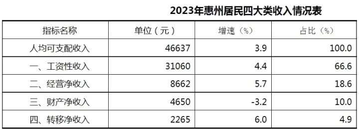 調(diào)查數(shù)據(jù)顯示,2023年,惠州居民的四大收入中,除財產(chǎn)性凈收入外,其余的工資性收入、經(jīng)營凈收入和轉(zhuǎn)移凈收入均實(shí)現(xiàn)了增加。