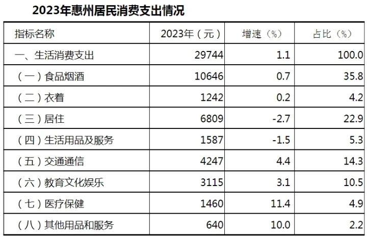 從支出來看,調(diào)查數(shù)據(jù)顯示,2023年惠州居民人均消費(fèi)支出29744元,同比增長1.1%。分城鄉(xiāng)來看,城鎮(zhèn)居民人均消費(fèi)支出32810元,同比增長0.7%,農(nóng)村居民人均消費(fèi)支出21494元,同比增長2.9%。