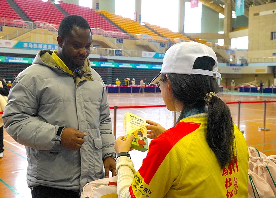 加納跑友正在領取“惠馬”參賽包。