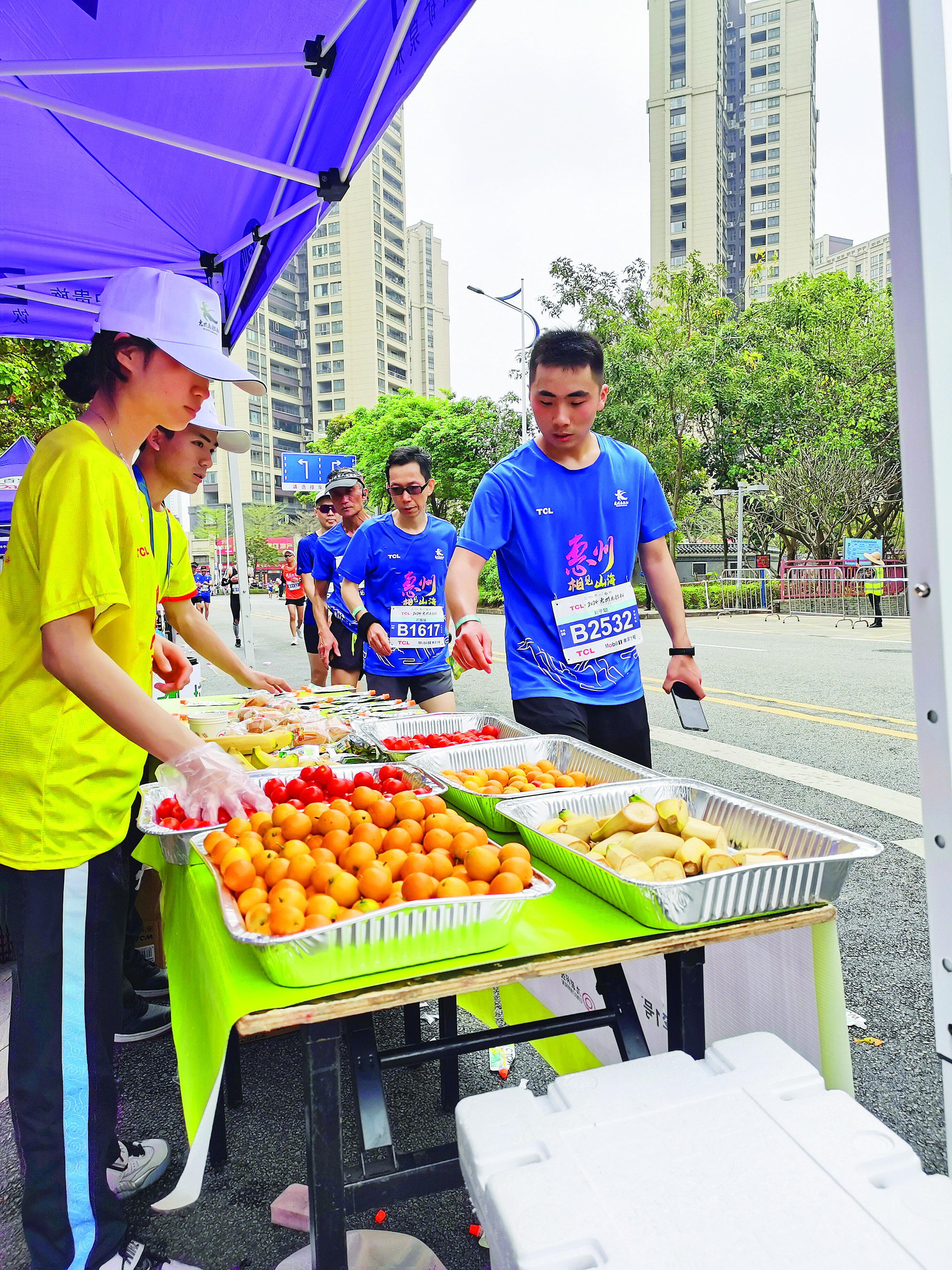 “來來,喝點水,吃點水果,拿點能量膠,加油!加油!”一有選手們跑過,志愿者就熱情地招呼起來,紛紛遞上能量補給物資,動作熟練而迅速,確保每一位選手都能在最短的時間內(nèi)完成補給。