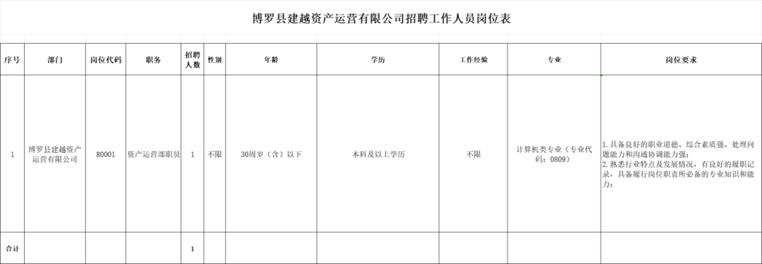 博羅縣建越資產(chǎn)運營有限公司2024年公開招聘1名工作人員