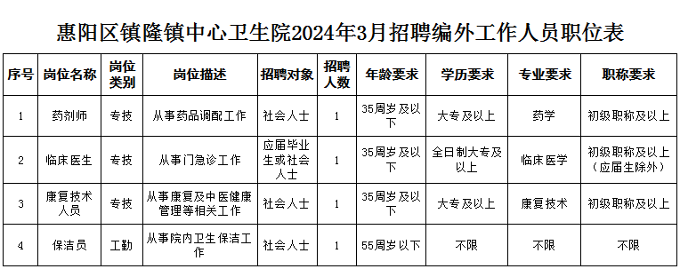 惠陽鎮(zhèn)隆鎮(zhèn)中心衛(wèi)生院2024年3月公開招聘工作人員