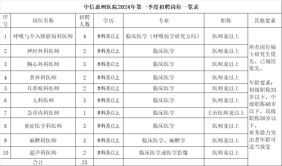 中信惠州醫(yī)院2024年第一季度招聘計劃