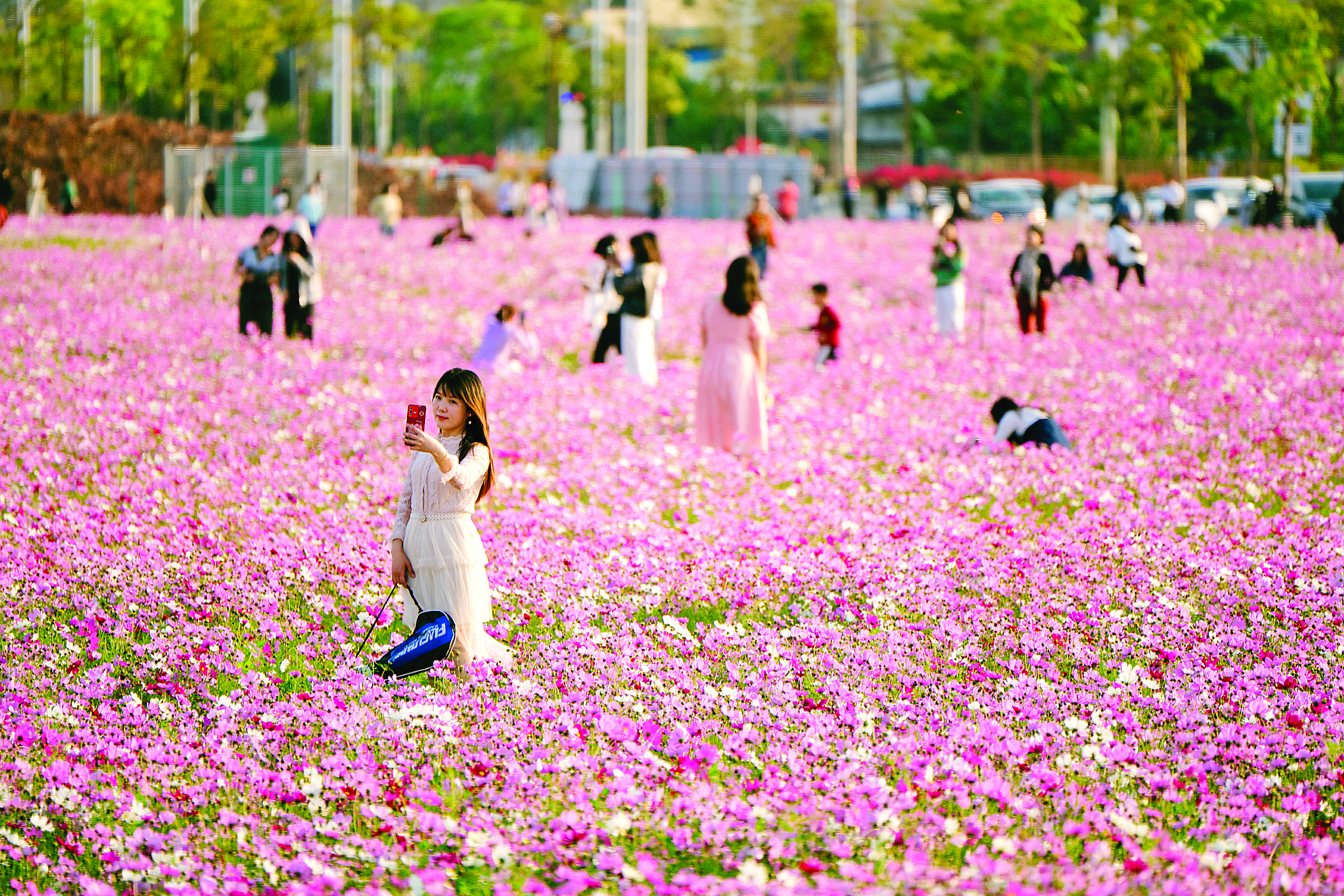 時(shí)正三月,春暖花開(kāi);葜荽蠼中∠锏母鞣N花卉迎來(lái)盛開(kāi)期,不少市民走出家門(mén)感受春天的溫暖與浪漫。在市區(qū)江北小金河大道沿途,一叢叢一片片的簕杜鵑、格;ㄕ裏崃揖`放,裝點(diǎn)著綠美惠州的畫(huà)卷。