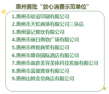 為進一步推進放心消費“雙承諾”單位的建設,著力打造經(jīng)營規(guī)范有序、消費安全滿意的放心消費環(huán)境,惠州市消費者權(quán)益保護委員會組織開展了全市首批“放心消費示范單位”選樹活動。在啟動儀式上,惠州市消費者權(quán)益保護委員會發(fā)布了惠州首批“放心消費示范單位”名單,并為這9家企業(yè)單位頒發(fā)了標牌。