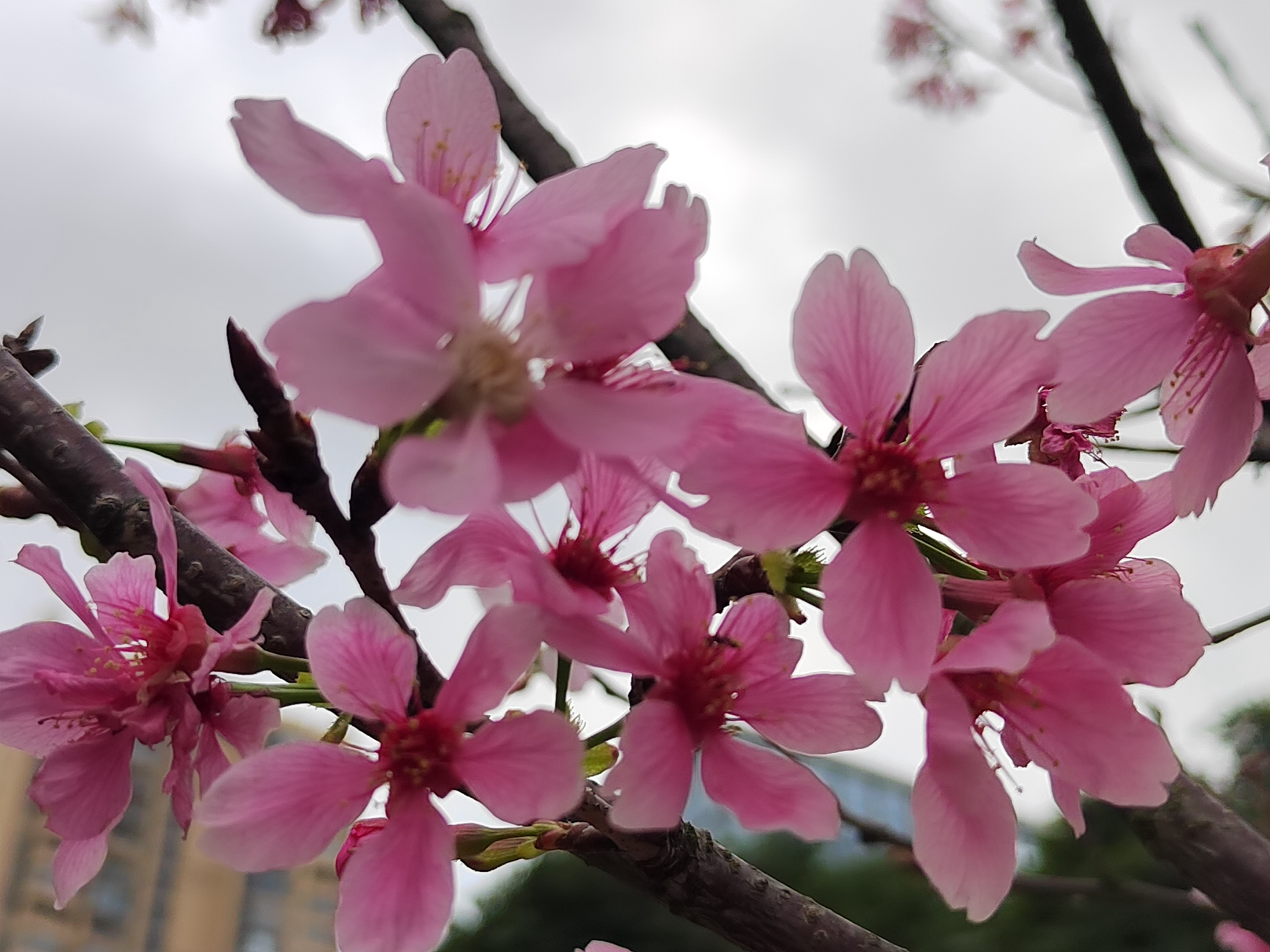金山湖公園的櫻花期在3月—4月。根據(jù)當(dāng)年氣候,花先于葉開放或花葉同存一樹,春芽綠色;ㄝ鄿\紫褐色,萼筒鐘狀壺形,萼5片,另常有萼瓣1個(gè)。2到3朵花組成一個(gè)花序;ㄐ捅挤,盛開時(shí)五個(gè)粉紅色橢圓形花瓣張開在近乎一個(gè)平面上,花瓣先端缺刻。雌蕊1枚。雄蕊散射,有長有短,花絲玫紅色或白色;ɡ倜导t色,然后隨著花朵展開會慢慢變淺粉。與其他品種的櫻花相比,廣州櫻一整株樹也會有顏色的變化。