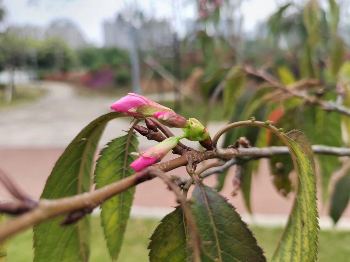 目前,金山湖公園栽植的是廣州櫻。廣州櫻當(dāng)屬“廣州產(chǎn)”。其通過技術(shù)改良培育,能適應(yīng)12℃以上氣溫,是適宜在華南地區(qū)種植的耐熱櫻花品種之一。樹皮紫褐色,平滑有光澤,有橫紋。葉互生,橢圓形或倒卵狀橢圓形,邊緣有芒齒,先端尖而有腺體,表面深綠色,有光澤,背面稍淡。