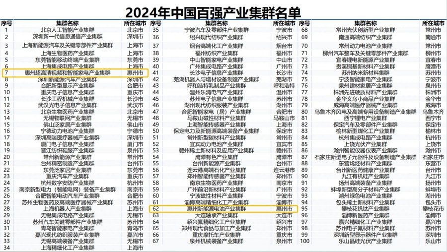 惠州兩大產(chǎn)業(yè)集群蟬聯(lián)上榜中國百強產(chǎn)業(yè)集群