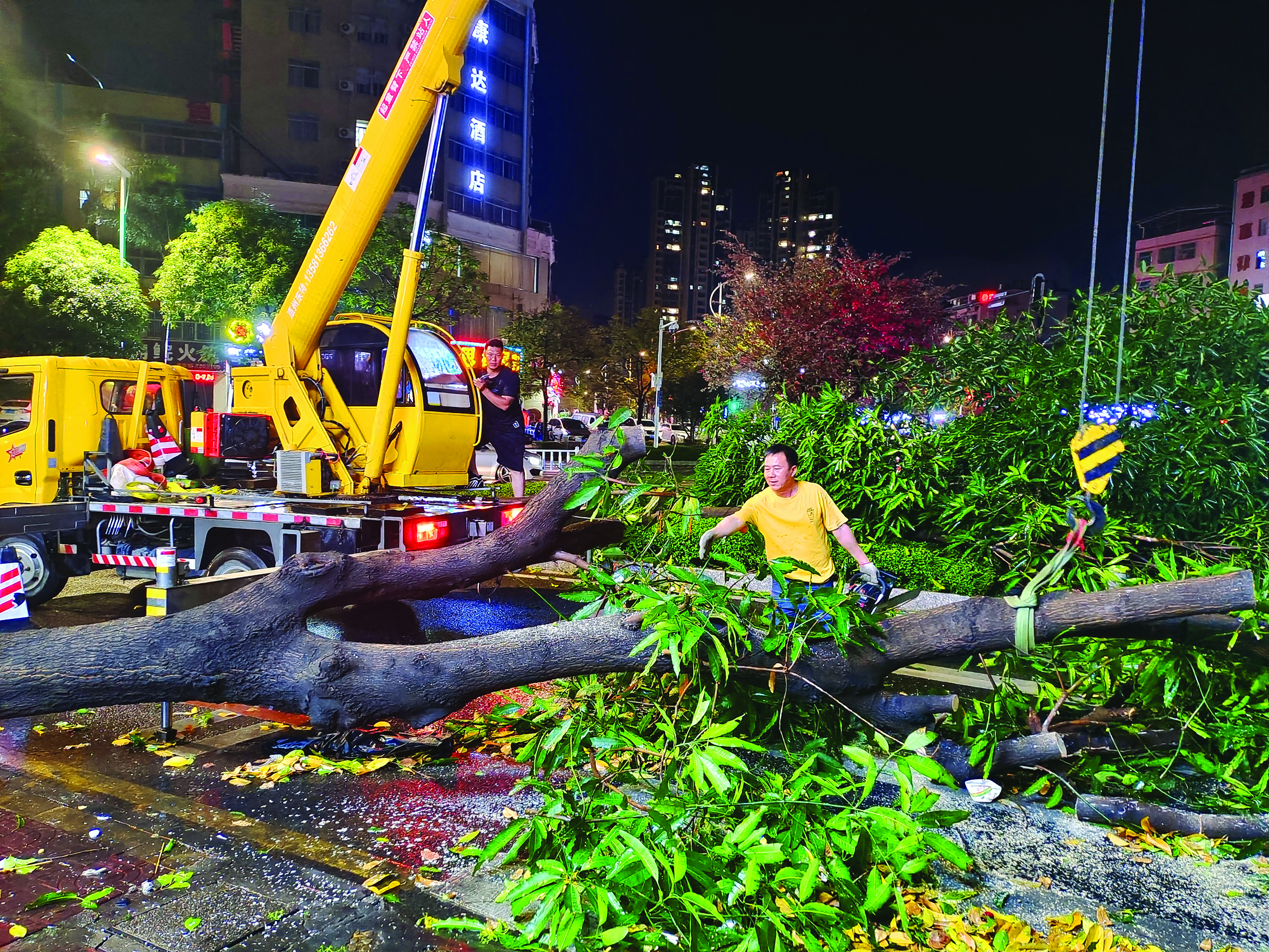 強雷雨導(dǎo)致市區(qū)多地樹木出現(xiàn)倒伏。記者29日22時許在市區(qū)江北三新北路看到,3棵直徑約40厘米的大樹被瞬時大風(fēng)吹倒,隨即聯(lián)系市政園林管理部門處理。3輛施工車輛迅速前來進行緊急清障,將影響交通的樹木用油鋸進行快速切割,用吊車將樹枝轉(zhuǎn)運到不影響交通的空地上,隨后逐一將樹枝進行轉(zhuǎn)運。