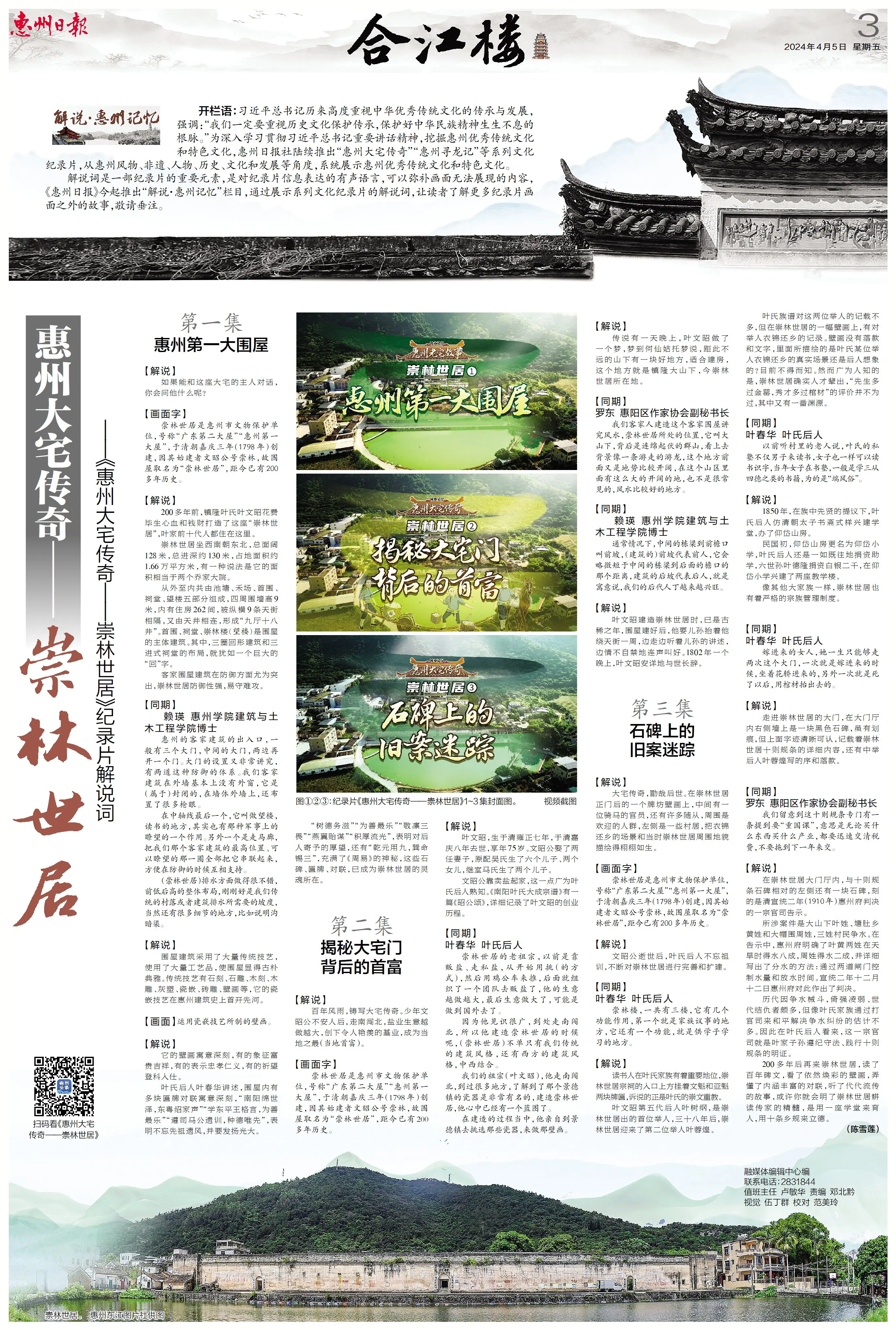 開欄語:習近平總書記歷來高度重視中華優(yōu)秀傳統(tǒng)文化的傳承與發(fā)展,強調(diào):“我們一定要重視歷史文化保護傳承,保護好中華民族精神生生不息的根脈!睘樯钊雽W習貫徹習近平總書記重要講話精神,挖掘惠州優(yōu)秀傳統(tǒng)文化和特色文化,惠州日報社陸續(xù)推出“惠州大宅傳奇”“惠州尋龍記”等系列文化紀錄片,從惠州風物、非遺、人物、歷史、文化和發(fā)展等角度,系統(tǒng)展示惠州優(yōu)秀傳統(tǒng)文化和特色文化。