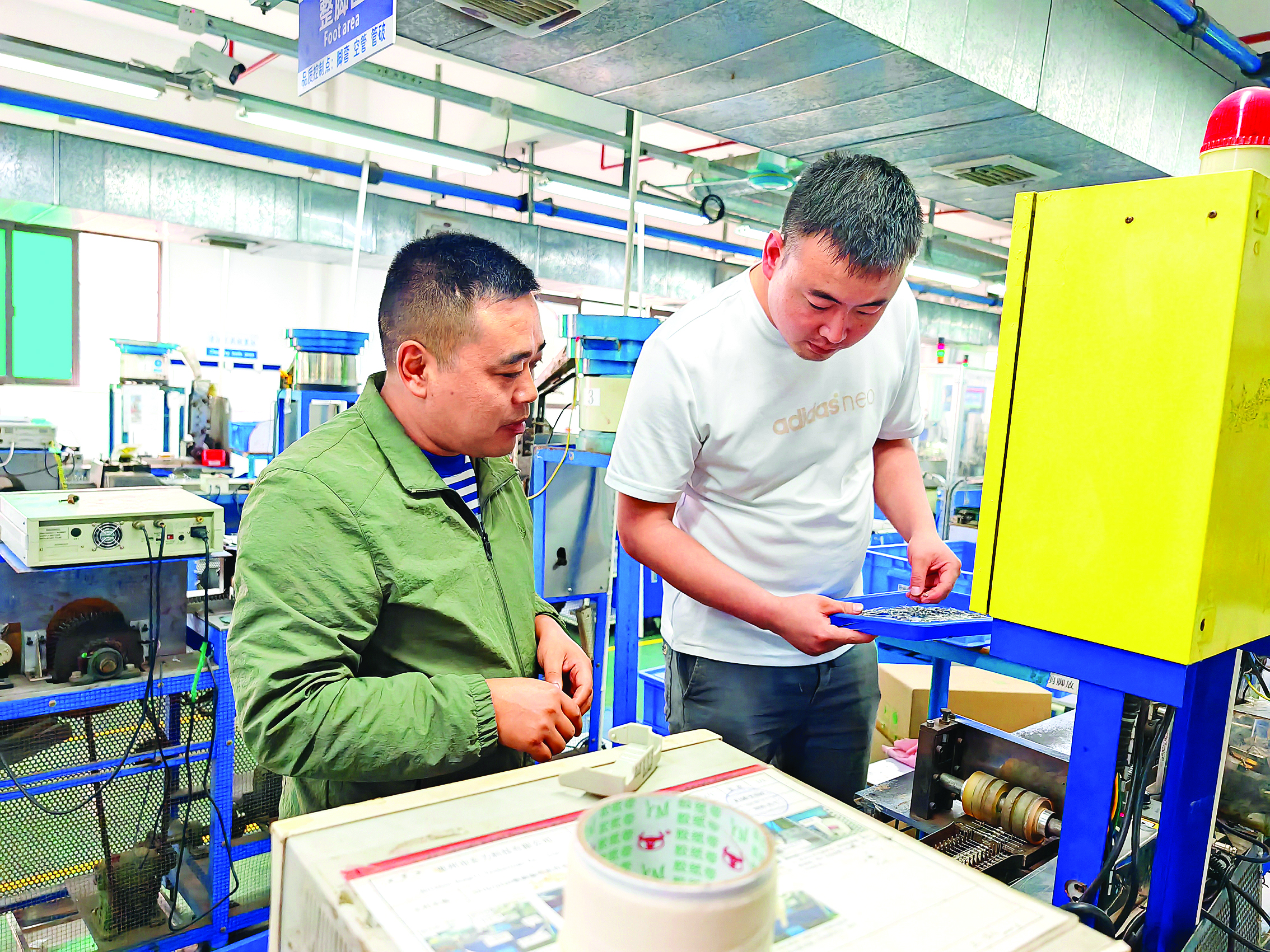 董得景(左)和技術(shù)人員研究產(chǎn)品生產(chǎn)工藝。