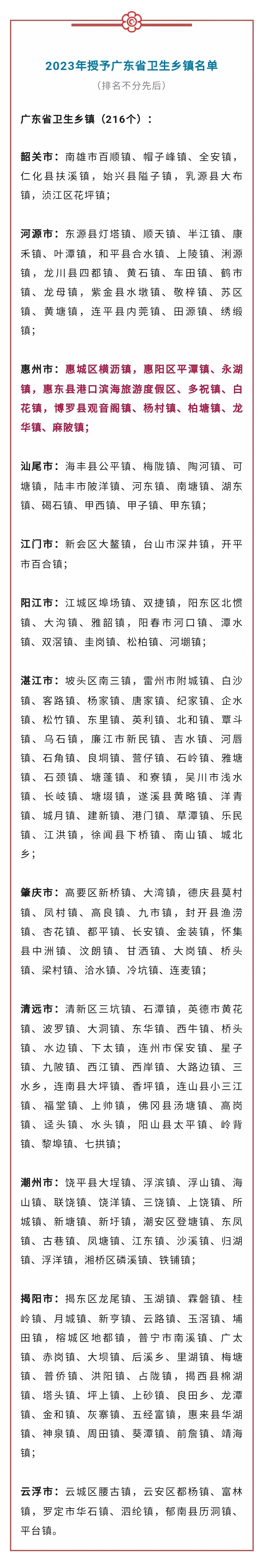 經(jīng)評(píng)審和復(fù)核,廣東省愛(ài)國(guó)衛(wèi)生運(yùn)動(dòng)委員會(huì)決定,授予韶關(guān)南雄市百順鎮(zhèn)等216個(gè)鎮(zhèn)“廣東省衛(wèi)生鄉(xiāng)鎮(zhèn)”榮譽(yù)稱號(hào),并向以上單位頒發(fā)獎(jiǎng)牌,以資鼓勵(lì)。其中惠州市惠城區(qū)橫瀝鎮(zhèn),惠陽(yáng)區(qū)平潭鎮(zhèn)、永湖鎮(zhèn),惠東縣港口濱海旅游度假區(qū)、多祝鎮(zhèn)、白花鎮(zhèn),博羅縣觀音閣鎮(zhèn)、楊村鎮(zhèn)、柏塘鎮(zhèn)、龍華鎮(zhèn)、麻陂鎮(zhèn)榜上有名。