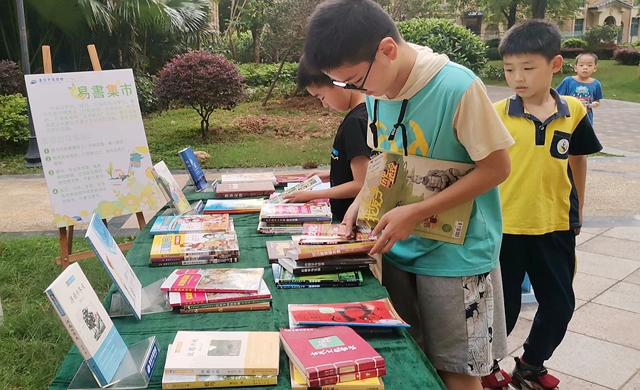 現(xiàn)場(chǎng),以“綠色環(huán)保、交換分享”為主旨的易書集市前吸引了不少居民駐足;另一側(cè)的“惠享閱讀家”招募現(xiàn)場(chǎng),同樣引來了許多居民的關(guān)注。