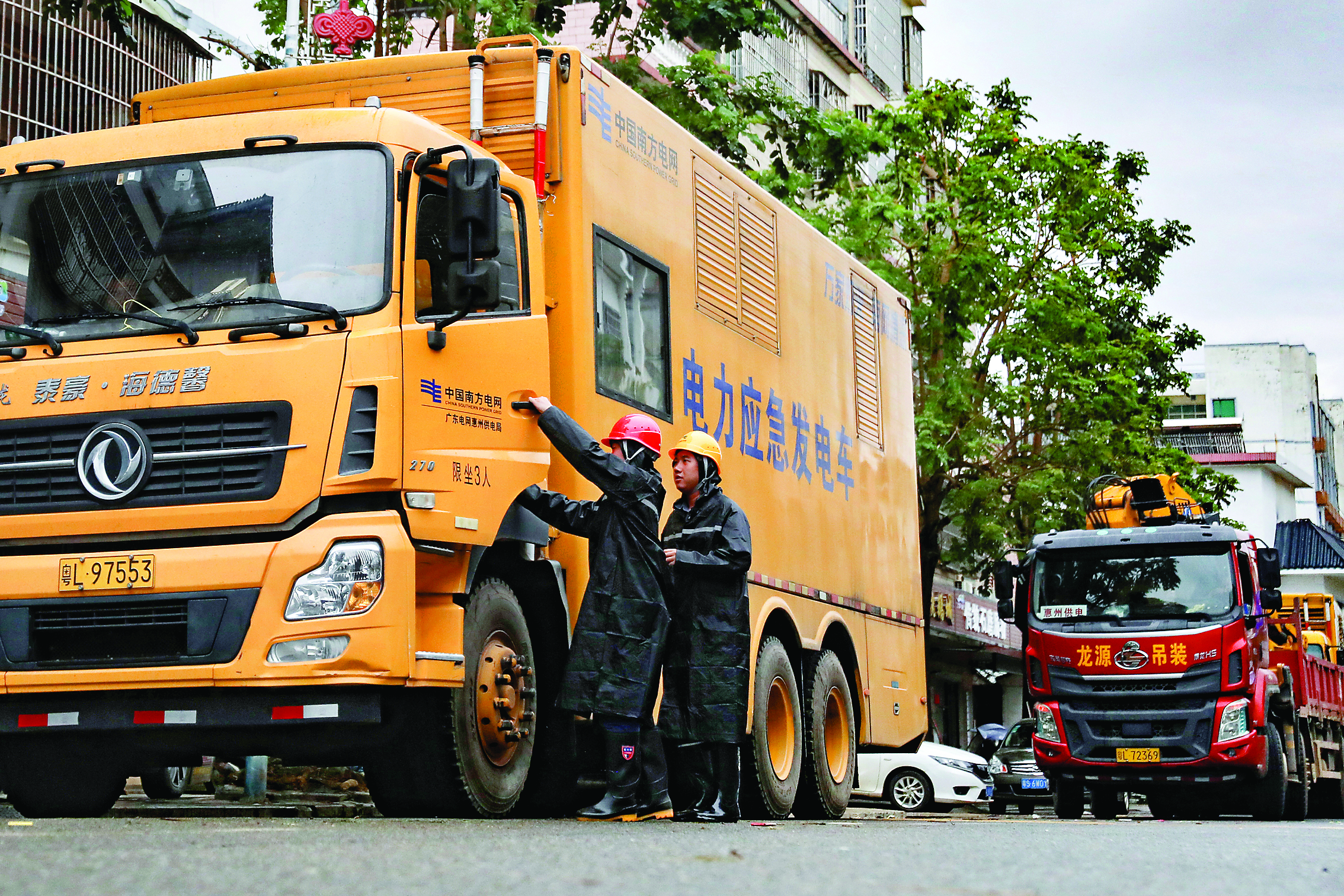 4月28日,博羅供電局搶修人員在橫河鎮(zhèn)布置發(fā)電車。通訊員廖偉興 攝