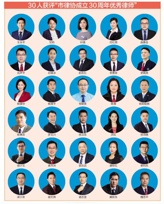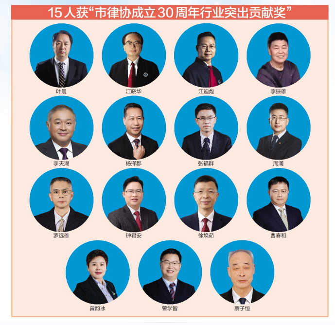 惠州市律師協(xié)會成立30年來,為全市經(jīng)濟社會發(fā)展貢獻了智慧和力量,為保障法律正確實施、維護群眾合法權(quán)益、服務經(jīng)濟社會發(fā)展、促進社會公平正義作出了積極貢獻,涌現(xiàn)出了一大批先進集體、先進個人。為表彰先進,激勵法律工作者不忘初心、牢記使命、振奮精神、奮發(fā)進取,市律師協(xié)會決定,授予15家律所“市律協(xié)成立30周年行業(yè)代表性律所”稱號,授予15人“市律協(xié)成立30周年行業(yè)突出貢獻獎”,授予30人“市律協(xié)成立30周年優(yōu)秀律師”稱號,評選30個“市律協(xié)成立30周年優(yōu)秀案例”,為65名律師頒發(fā)“市律協(xié)成立30周年光榮執(zhí)業(yè)30年紀念章”。