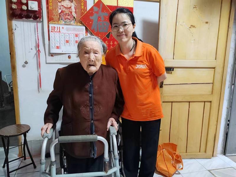 “黃婆婆,我來了,有沒有想我啊?”4月底的一個雨天,90后上門康復師范思婷熟門熟路地拐進惠城區(qū)橋西街道爾雅巷社區(qū)一幢居民樓,走進逼仄的樓梯間,來到二樓老人住處。從一年前開始,每周二上午9點,她都會風雨無阻地準時奔赴和百歲老人黃婆婆的“約會”。