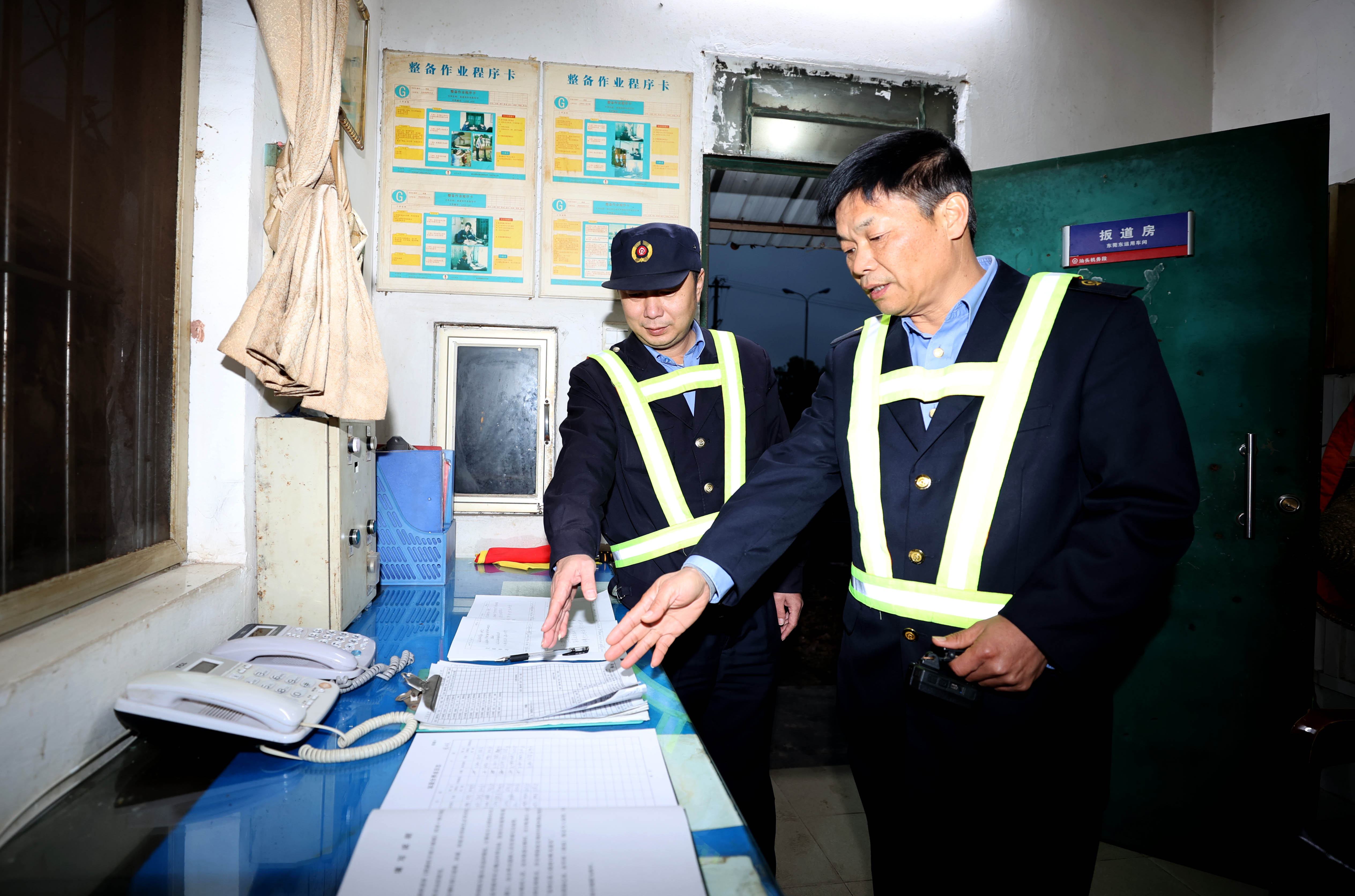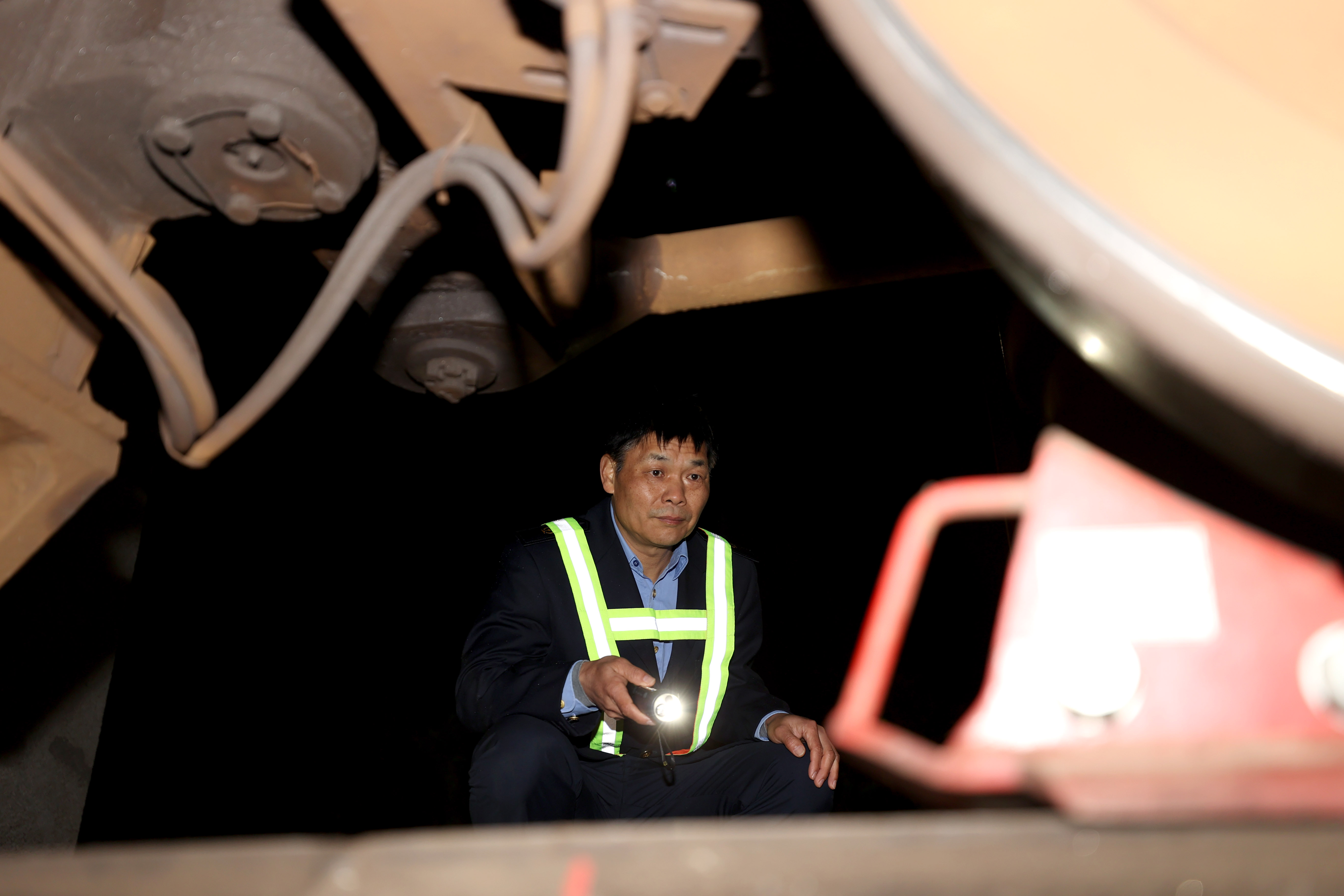 打著手電筒,逐一檢查停在整備場(chǎng)的機(jī)車(chē)防溜情況。