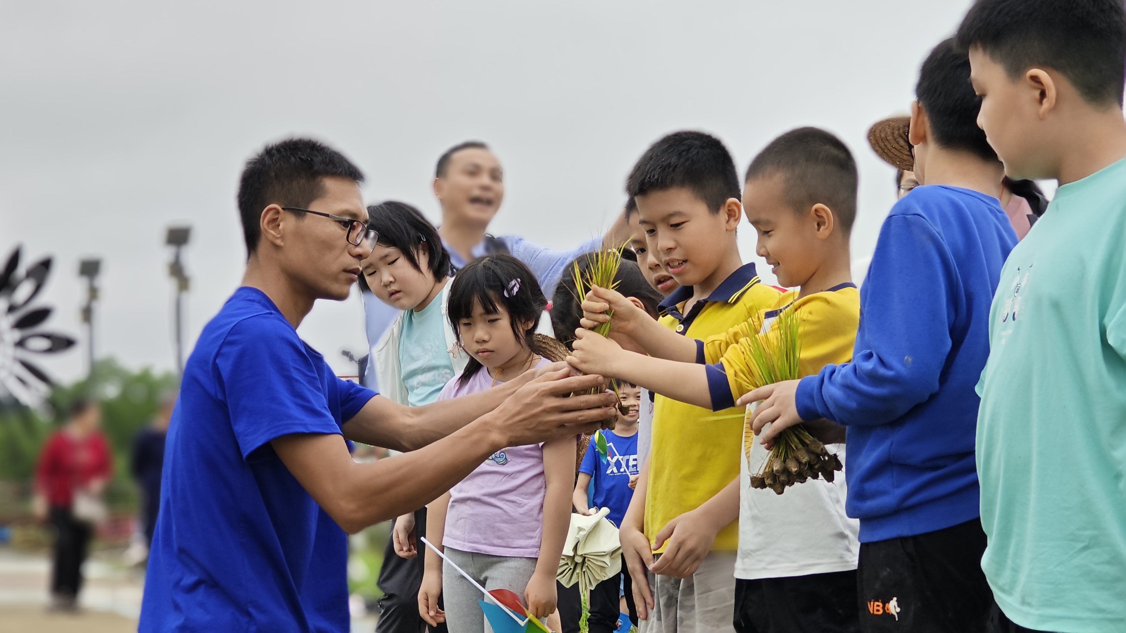 在惠城區(qū)橫瀝鎮(zhèn)墨園村,孩子們正學(xué)習(xí)插秧。 惠州日?qǐng)?bào)記者陳春惠 攝