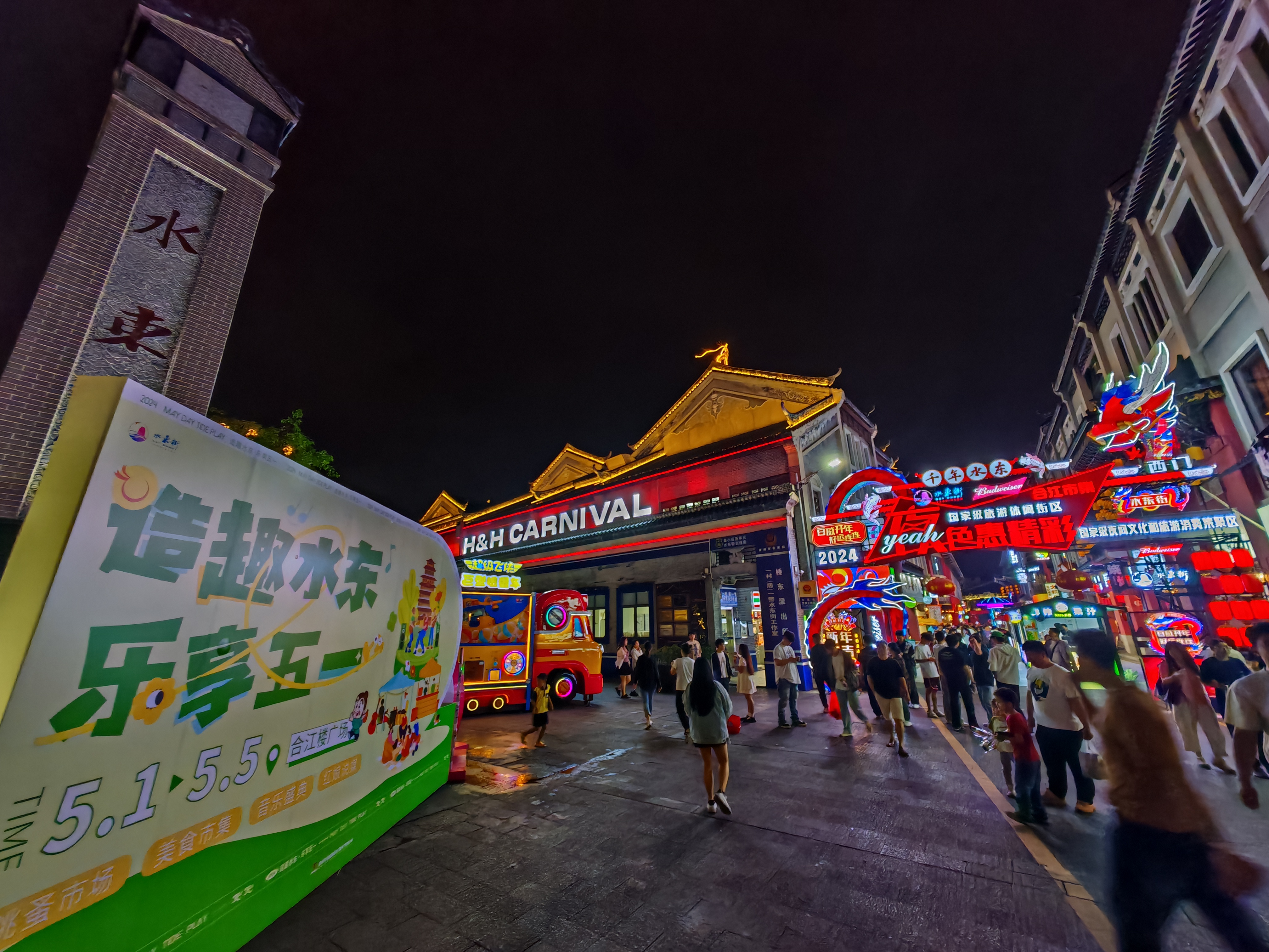 隨著夜幕降臨,市區(qū)水東街“亮”了起來,也愈加“熱”了起來。這里正舉辦惠州美食集市,邀約特色美食商家參與展示和銷售,還搭建了美食音樂節(jié)舞臺(tái)。不遠(yuǎn)處,人潮熙熙攘攘也很火爆!拔逡弧逼陂g,這里有個(gè)性跳蚤市場(chǎng)、美食市集、音樂盛典、大紅娘朱姐說媒等多種特色主題活動(dòng)。