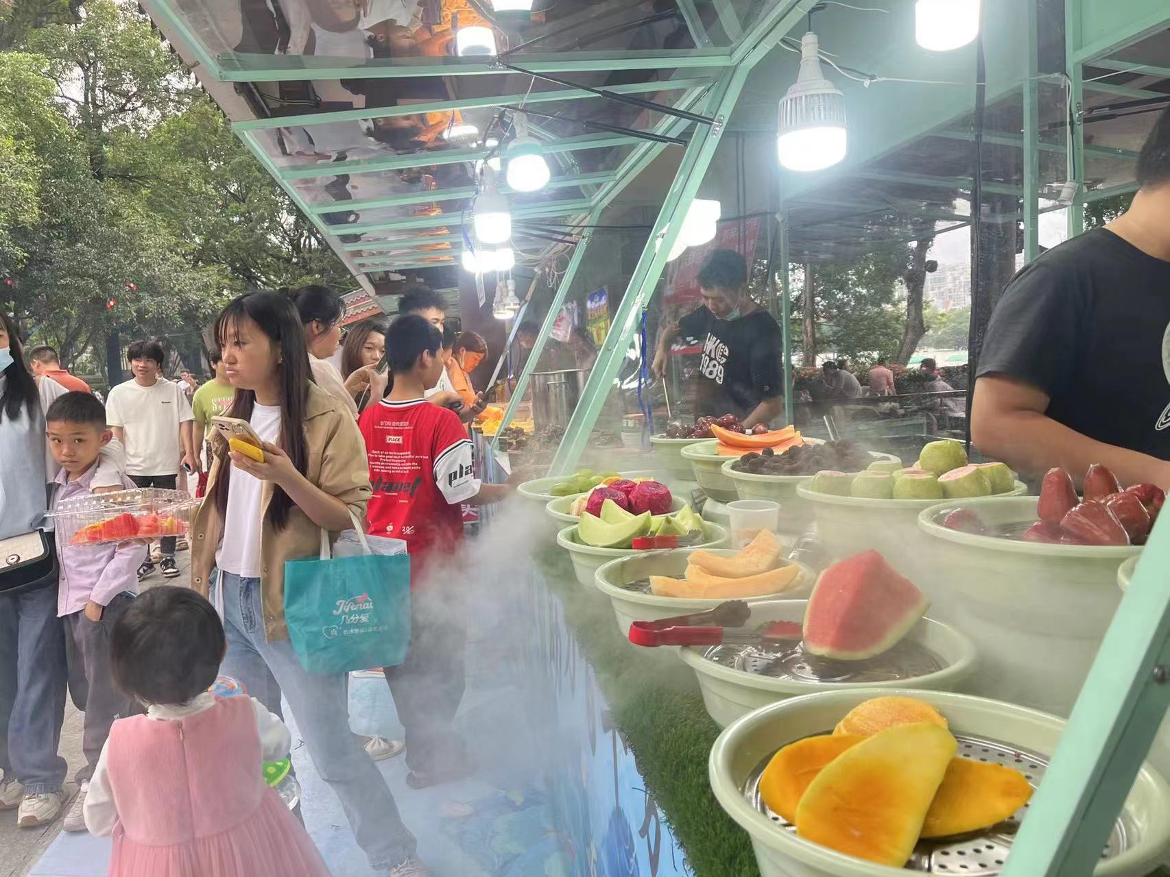 市民游客在“東坡市集”攤位前品嘗購(gòu)買水果。