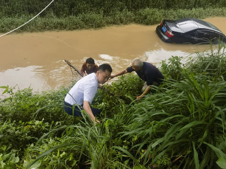 當(dāng)時(shí)已來(lái)不及多想,熊曉朋、林煥中立即驅(qū)車(chē)上前,發(fā)現(xiàn)一輛黑色小車(chē)掉進(jìn)路邊的水溝里,水已接近淹沒(méi)前車(chē)窗,小車(chē)司機(jī)緩慢從車(chē)窗爬出,向車(chē)頂爬去,車(chē)頭正往水溝中繼續(xù)沉入,情勢(shì)非常危險(xiǎn)。