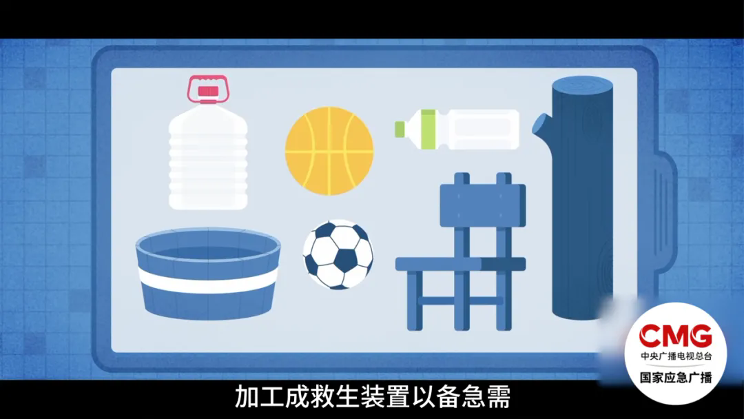 1.搜集木盆、木材、大件泡沫塑料等適合漂浮的材料,加工成救生裝置。