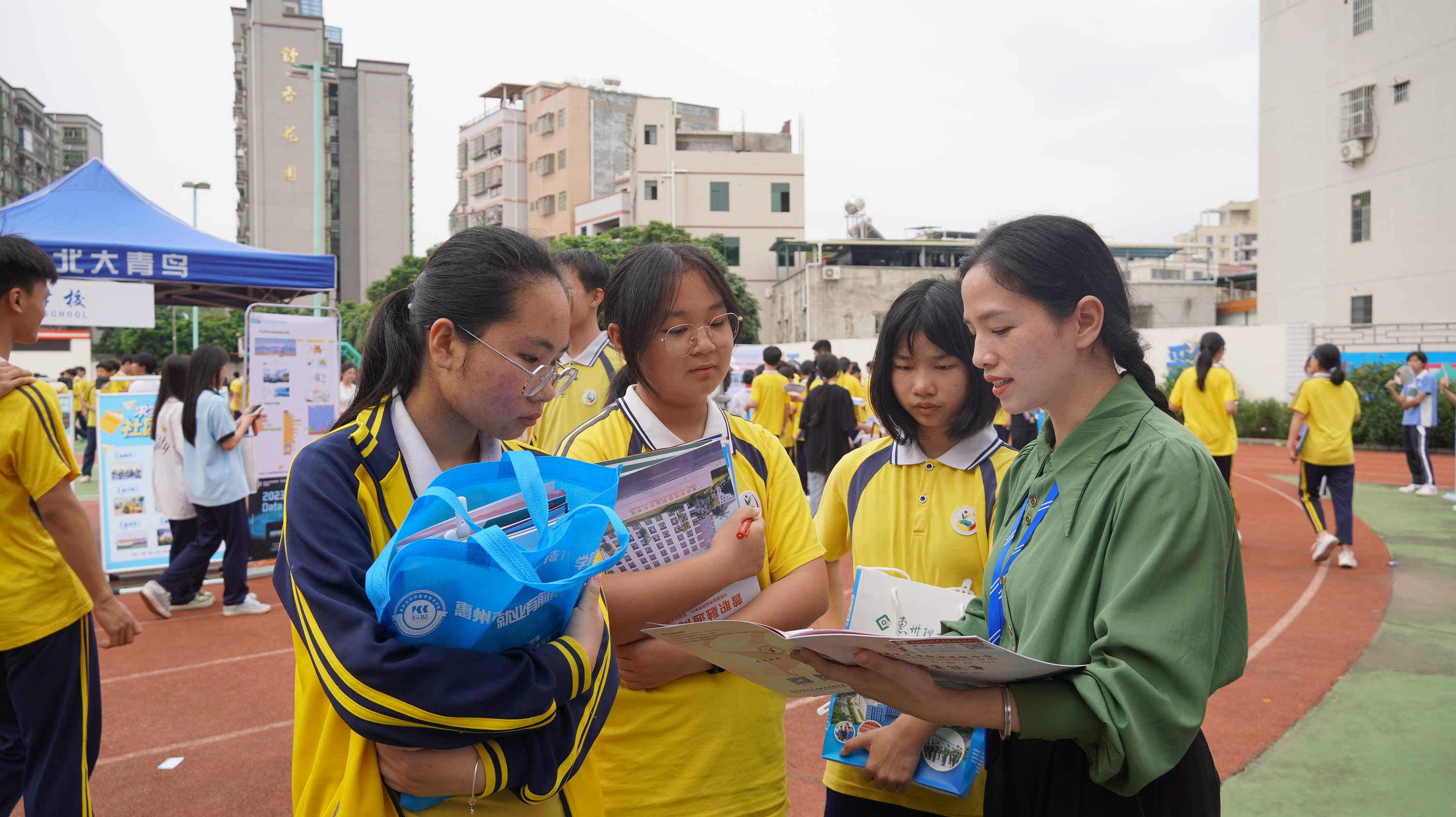 在惠州市演達(dá)中學(xué),記者看到學(xué)校運(yùn)動(dòng)場(chǎng)跑道周邊整齊地?cái)[放著宣傳展位和各類展板。參與活動(dòng)的中職(技工)院校工作人員統(tǒng)一著裝,佩戴工作證。各個(gè)學(xué)校的展位前都擺放了宣傳學(xué)校辦學(xué)特色和招生情況的宣傳單、宣傳冊(cè),供學(xué)生們自由取閱;顒(dòng)現(xiàn)場(chǎng),招生老師被學(xué)生們團(tuán)團(tuán)圍住,大家紛紛就關(guān)心的招生條件、專業(yè)設(shè)置、就業(yè)情況等問題提問。招生老師耐心細(xì)致地一一回答。