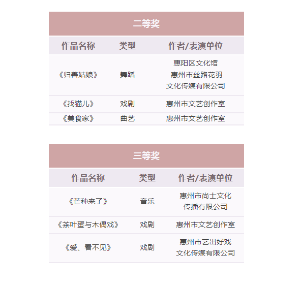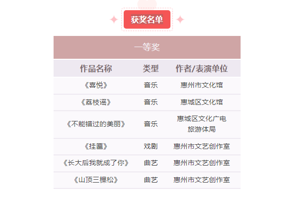 2023年度廣東省群眾文藝作品評(píng)選工作于2024年4月組織開(kāi)展,惠州報(bào)送的音樂(lè)類(lèi)作品《喜悅》《荔枝謠》、戲劇類(lèi)作品《掛匾》、曲藝類(lèi)作品《長(zhǎng)大后我就成了你》等23個(gè)作品選送省群眾文藝作品評(píng)選活動(dòng),其中過(guò)半數(shù)作品獲優(yōu)異成績(jī),一等獎(jiǎng)獲獎(jiǎng)比例為近年之最。