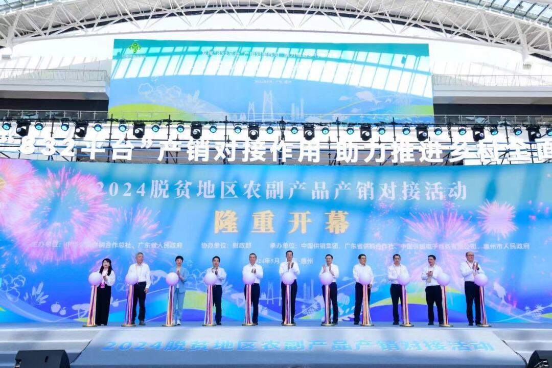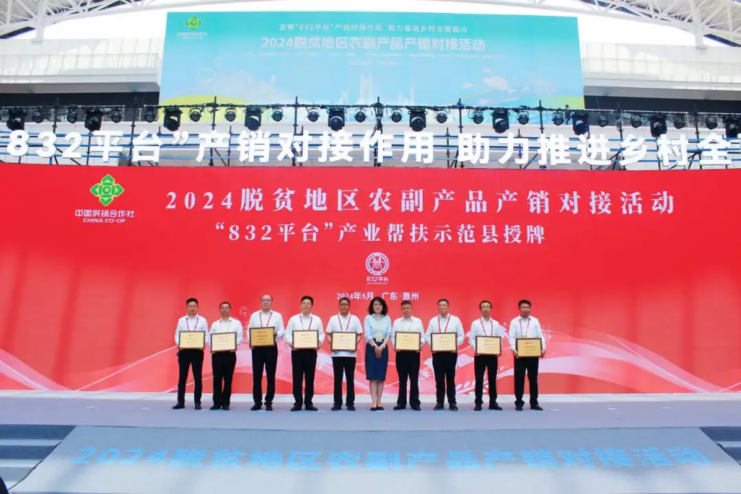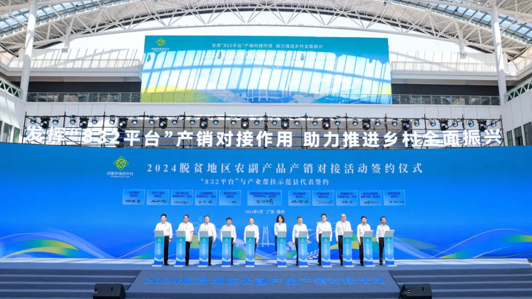 2024年5月15日,2024脫貧地區(qū)農(nóng)副產(chǎn)品產(chǎn)銷對(duì)接活動(dòng)在廣東省惠州市粵港澳大灣區(qū)綠色農(nóng)產(chǎn)品生產(chǎn)供應(yīng)基地勝利開幕,“832平臺(tái)產(chǎn)業(yè)幫扶示范縣”項(xiàng)目集體亮相。在產(chǎn)銷對(duì)接活動(dòng)開幕式上,產(chǎn)業(yè)幫扶示范縣政府代表新疆喀什市市委副書記、市長(zhǎng)偉力·阿西木作為脫貧地區(qū)地方政府代表發(fā)言、“黔江羊肚菌”推介官作為優(yōu)質(zhì)農(nóng)產(chǎn)品推介代表上臺(tái)“帶貨”,第二批10家“832平臺(tái)產(chǎn)業(yè)幫扶示范縣”集體簽約并授牌。在“832平臺(tái)成就展”特設(shè)“產(chǎn)業(yè)幫扶示范縣”展區(qū),集中展示恩施硒茶、臨泉豬肉、一盒子喀什、金寨山茶油等脫貧地區(qū)“土特產(chǎn)”打造成果。