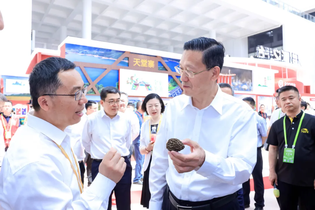 重慶黔江區(qū)副區(qū)長(zhǎng)毛立新向中華全國供銷合作總社黨組書記、理事會(huì)副主任韓立平介紹“黔江羊肚菌”