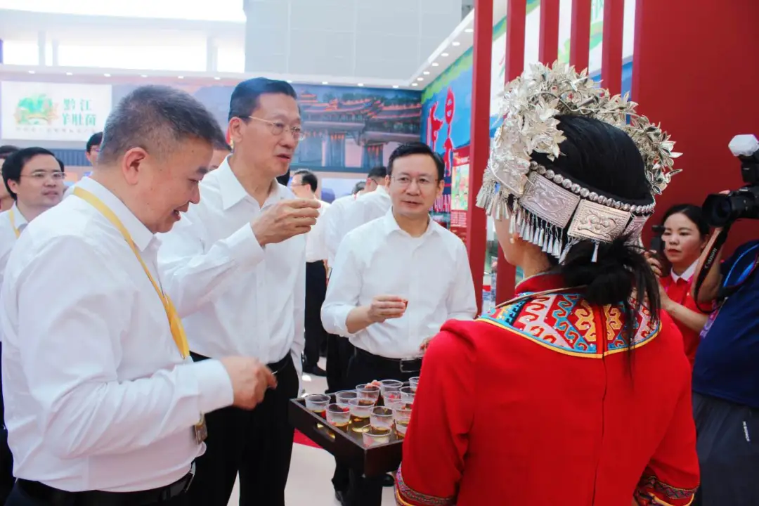 湖北恩施州副州長(zhǎng)楊盛僚向中華全國供銷合作總社黨組書記、理事會(huì)副主任韓立平介紹“恩施硒茶”