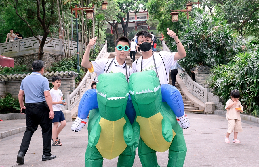 市民黃秋梅和5歲的兒子來(lái)了個(gè)“中西合璧”,分別扮演“白雪公主”和“孫悟空”,吸引了不少眼球!敖衲3月我們參加了惠州馬拉松歡樂(lè)跑,看到了不少‘顯眼包’裝扮,感覺(jué)特別有趣,孩子也很喜歡,還想再次參加類似的活動(dòng),得知惠州舉行City walk活動(dòng),我們第一時(shí)間報(bào)名,并購(gòu)買了這兩套顯眼包服飾,制造‘驚喜’,娛樂(lè)一下大家!秉S秋梅說(shuō),作為一名新惠州人,她非常喜歡惠州的生活環(huán)境和城市的包容感,看到不少家庭帶著孩子參加活動(dòng),大家熱愛生活、積極健康的狀態(tài)讓她很受鼓舞。