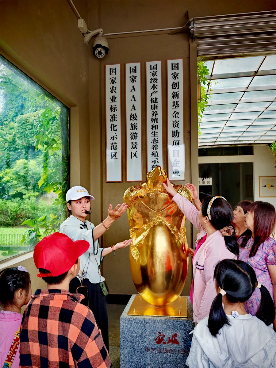 帶著好奇心入園參觀,在廊道上透過明亮的玻璃窗,可以清晰地看見特為游客展示金錢龜生活在鳥語花香、潺潺流水的環(huán)境,可愛的小龜仔,三三兩兩在花叢草下或靜養(yǎng)或覓食或交談。小朋友們更是歡喜地看個不停,互相攀比誰發(fā)現(xiàn)小龜最多。家長們對龜園自產(chǎn)的各種保健品倍感興趣,紛紛購買。萬龜園作為金錢龜自產(chǎn)自銷的企業(yè),與龜有關(guān)的各種知識點都用心展示出來,長壽吉祥智慧的龜龜是中國文化中一個重要的象征元素,被人們深深喜愛。
