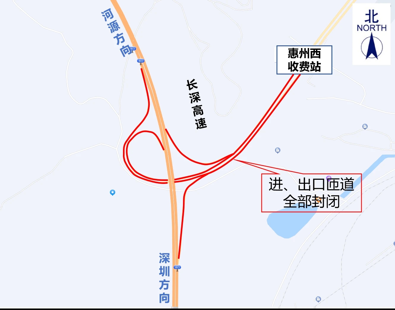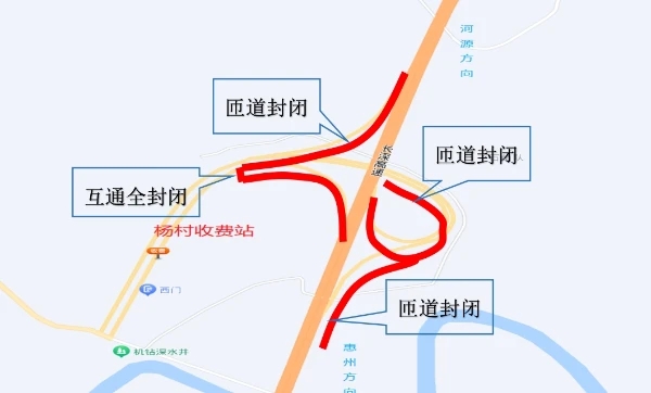 5月30日12:00至7月30日12:00,長深高速惠州段(惠河高速公路)楊村收費站進、出口匝道全部封閉,禁止車輛通行;