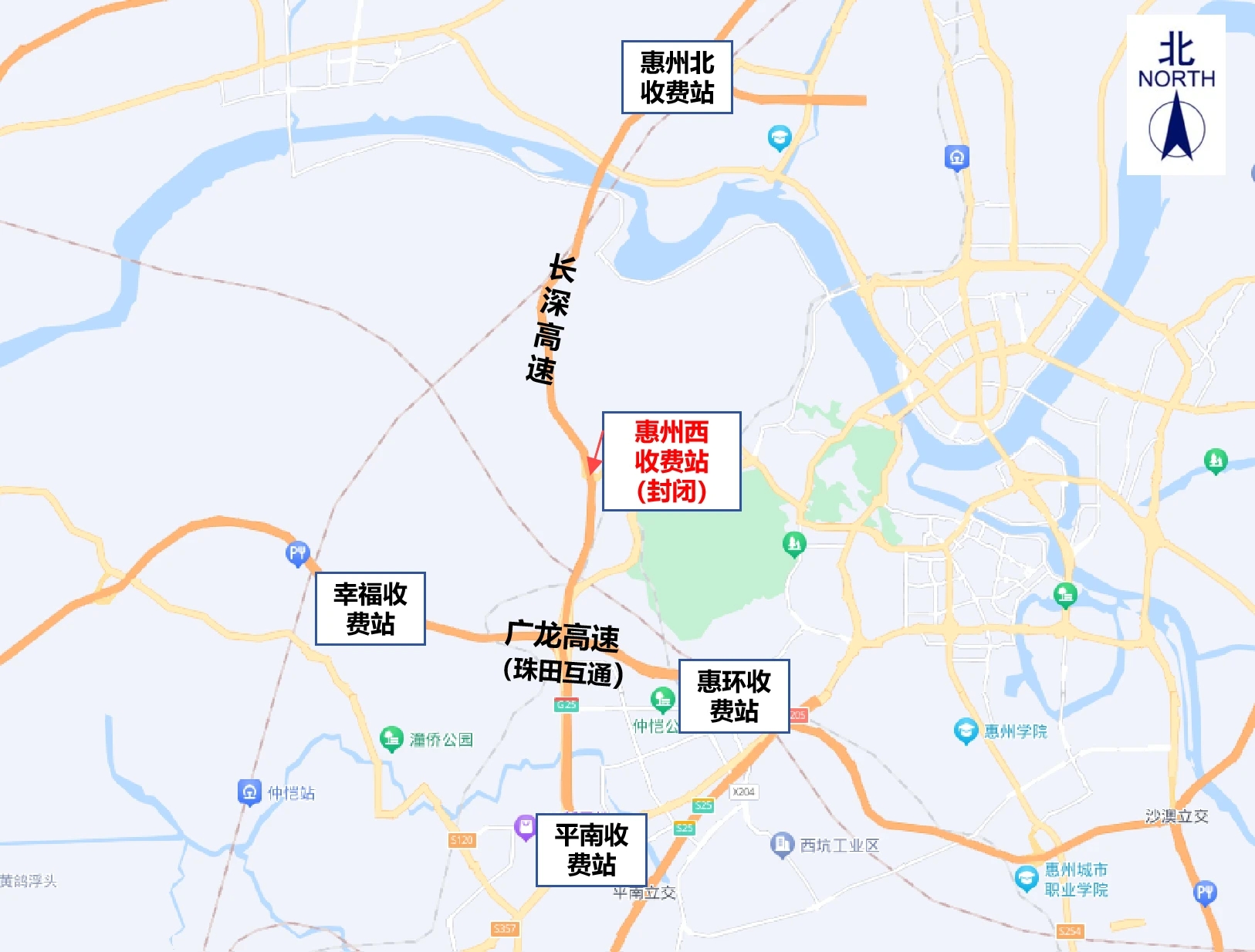 臨時交通管制期間,此前長深高速往返惠州選擇惠州西收費站通行的車輛,請選擇就近的惠州北收費站或平南收費站上下高速;或經(jīng)珠田互通轉廣龍高速,從幸福收費站或惠環(huán)收費站上下高速。