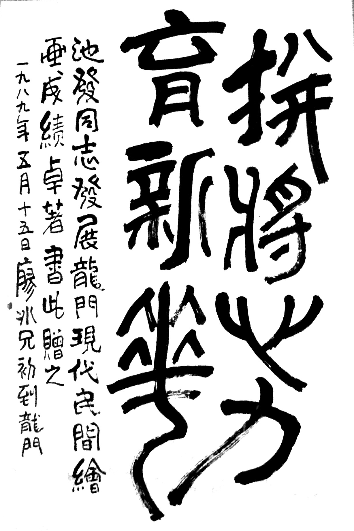 1989年初夏,著名漫畫家廖冰兄第一次到龍門,看見(jiàn)風(fēng)格獨(dú)特的龍門農(nóng)民畫,心生歡喜,欽佩譚池發(fā)“發(fā)展現(xiàn)代民間繪畫成績(jī)卓著”,題字“拼將心力育新花”贈(zèng)之,既是對(duì)譚池發(fā)培養(yǎng)繪畫人才的贊譽(yù),也是對(duì)龍門農(nóng)民畫后續(xù)發(fā)展的期望。