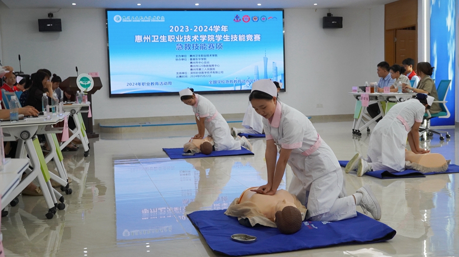 本次活動(dòng)作為惠州衛(wèi)生職業(yè)技術(shù)學(xué)院2024年職業(yè)教育活動(dòng)周的項(xiàng)目之一,除了急救培訓(xùn)外,還包括學(xué)生心肺復(fù)蘇競賽。競賽選手均為該校護(hù)理學(xué)院2023級3+2、3+證書以及2022級護(hù)理、助產(chǎn)專業(yè)的學(xué)生。他們是在完成相關(guān)實(shí)訓(xùn)操作課程后,經(jīng)過多輪篩選脫穎而出的優(yōu)秀選手。在職業(yè)教育活動(dòng)周期間,惠州衛(wèi)生職業(yè)技術(shù)學(xué)院還組織了師生無償獻(xiàn)血和科普義診活動(dòng)。