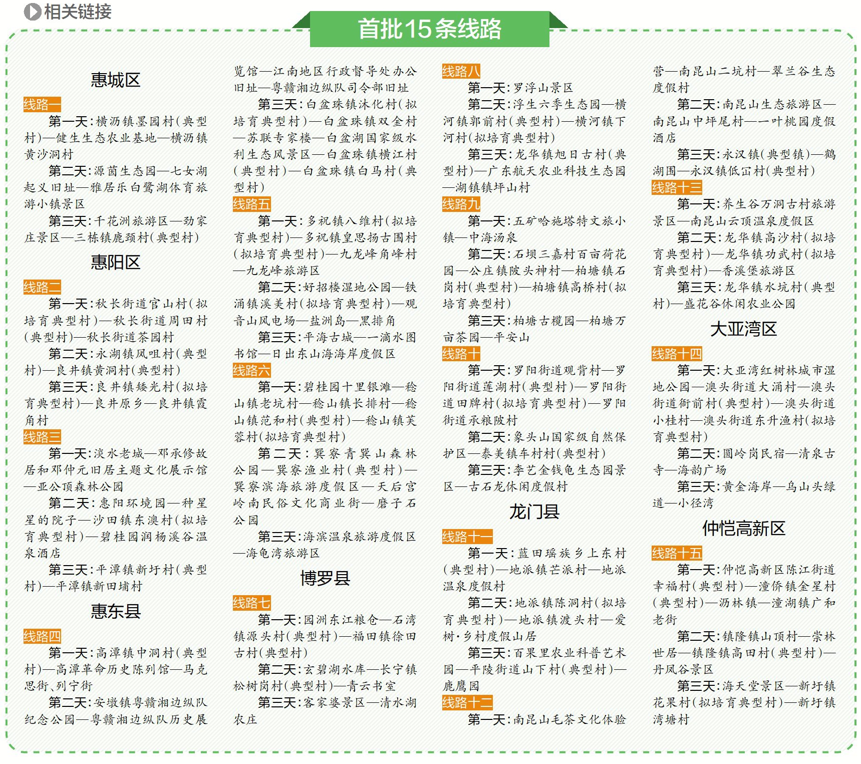 記者看到,首批15條活動(dòng)線路主題各不相同,且各線路通過(guò)整合全市精品旅游資源,涵蓋了各縣(區(qū))的“百千萬(wàn)工程”優(yōu)質(zhì)典型鎮(zhèn)村、特色(風(fēng)情)小鎮(zhèn)和文旅酒店度假綜合體等,從惠州工會(huì)職工鄉(xiāng)村療休養(yǎng)首批推薦線路延伸出的,是一個(gè)全方位展示惠州良好生態(tài)環(huán)境和嶄新城鄉(xiāng)發(fā)展面貌的窗口。
